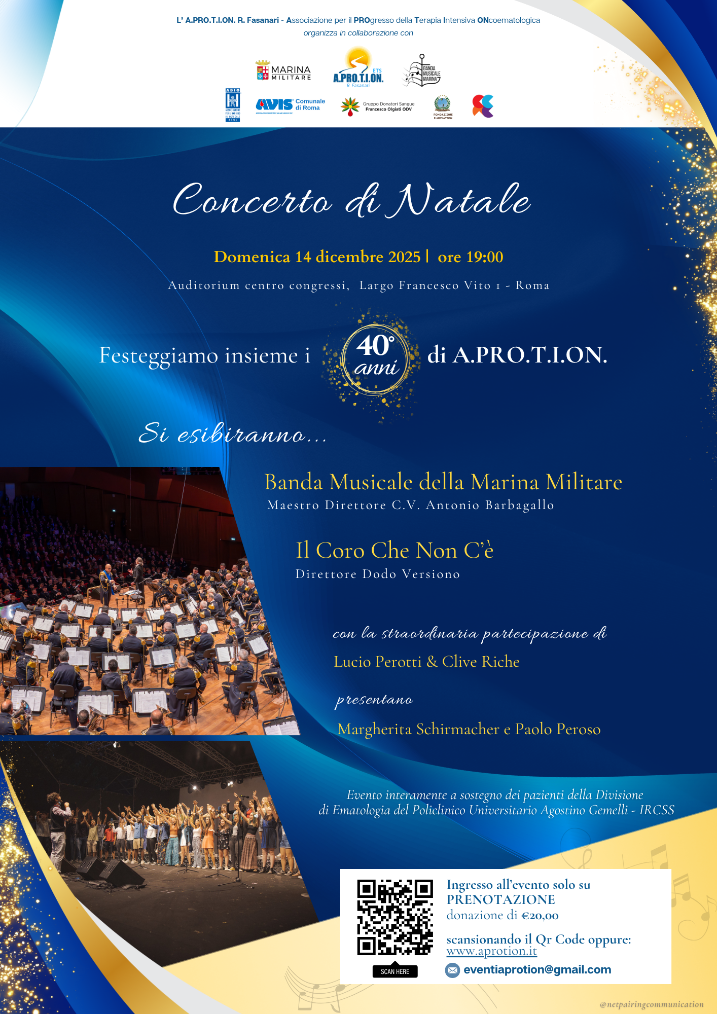 Roma, novembre 2025 – In occasione del 40° Anniversario dell’Associazione A.PRO.T.I.ON. ETS, torna uno degli appuntamenti più attesi del periodo natalizio: il Concerto di Natale A.PRO.T.I.ON., evento benefico in programma domenica 14 dicembre 2025 alle ore 19:00, presso l’Auditorium del Centro Congressi dell’Università Cattolica del Sacro Cuore (Largo Francesco Vito 1, Roma).