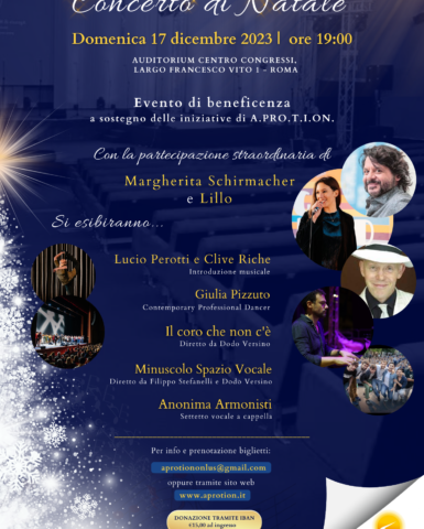 Rimani sempre aggiornato sugli Eventi A.PRO.T.I.ON. I nostri Eventi WEBINAR 2025 | La Sfida dell’Ematologia Vedi Concerto di Natale 2025 | 40° Anni di A.PRO.T.I.ON Vedi L’importanza della DONAZIONE nelle malattie Ematologiche Vedi La sfida dell’Ematologia | Webinar – 14 dicembre 2024 Vedi Concerto di Natale – 15 dicembre 2024 Vedi LO SPORT FA BENE! Vedi Aperitivo Jazz – 31 MAGGIO 2024 Vedi WEBINAR | La sfida dell’Ematologia – 16 dicembre 2023 Vedi WEBINAR – La Sfida dell’Ematologia | 14 dic 2024 Vedi Concerto di Natale – 17 dicembre 2023 Vedi Aperitivo Jazz – 12 MAGGIO 2023 | Roma Vedi Concerto di Natale – 18 DICEMBRE 2022 | Roma Vedi Webinar, LA SFIDA DELL’EMATOLOGIA – 17 DICEMBRE 2022 | Online Vedi Concerto di Natale del 14 DICEMBRE 2019 | Roma Vedi Convegno medico del 14 DICEMBRE 2019 | Roma Vedi Messa in reparto del 14 DICEMBRE 2019 | Roma Vedi Aperitivo di beneficenza del 10 MAGGIO 2019 | Roma Vedi Teatro illustrato – Uomini&Dei – Storie dell’Olimpo e dintorni del 30 MARZO 2019 | Roma Vedi Convegno medico e Concerto di Natale del 15 DICEMBRE 2018 | Roma Vedi Pranzo di beneficienza del 6 OTTOBRE 2018 | Roma Vedi Cena di beneficienza del 30 MAGGIO 2018 | Roma Vedi Convegno del 18 MAGGIO 2018 | Roma Vedi Cena di beneficienza del 20 APRILE 2017 | Roma Vedi 80 anni della A.S. ROMA 26 LUGLIO 2007 | Roma Vedi 1° memorial Angelo Sciscione – 4 APRILE 2015 | Terracina Vedi Premio Bontà del 24 MAGGIO 2009 | Roma Vedi San Pellegrino in fiore – Ed.2008/2009 | Viterbo Vedi Concerto a Caprarola del 5 GENNAIO 2009 | Caprarola Vedi Amarcord neroazzurro 18 NOVEMBRE 2006 | Latina Vedi